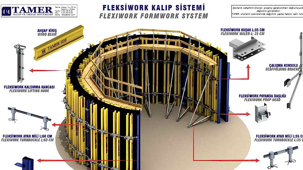 Fleksiwork Dairesel Perde Kalıbı Sistemi; değişken çapta dairesel perdeleri bulunan projeler için son derece ekonomik ve pratik bir kalıp sistemidir. Dairesel perdenin çapı değiştiğinde ayar milleri sayesinde farklı dairesel perdelerin dökümünde kullanılan ayarlı perde kalıbı sistemidir. Dairesel perdenin çapı değiştiğinde ayar milleri sayesinde kalıp değişen perde çapına uygun hale gelir. Çapı değişen perdenin uzunluğu da değişebilir, panolar arasına koyulacak ahşap malzemelerle Fleksiwork Kalıp Sistemi hızlı ve pratik çözümler sunar.